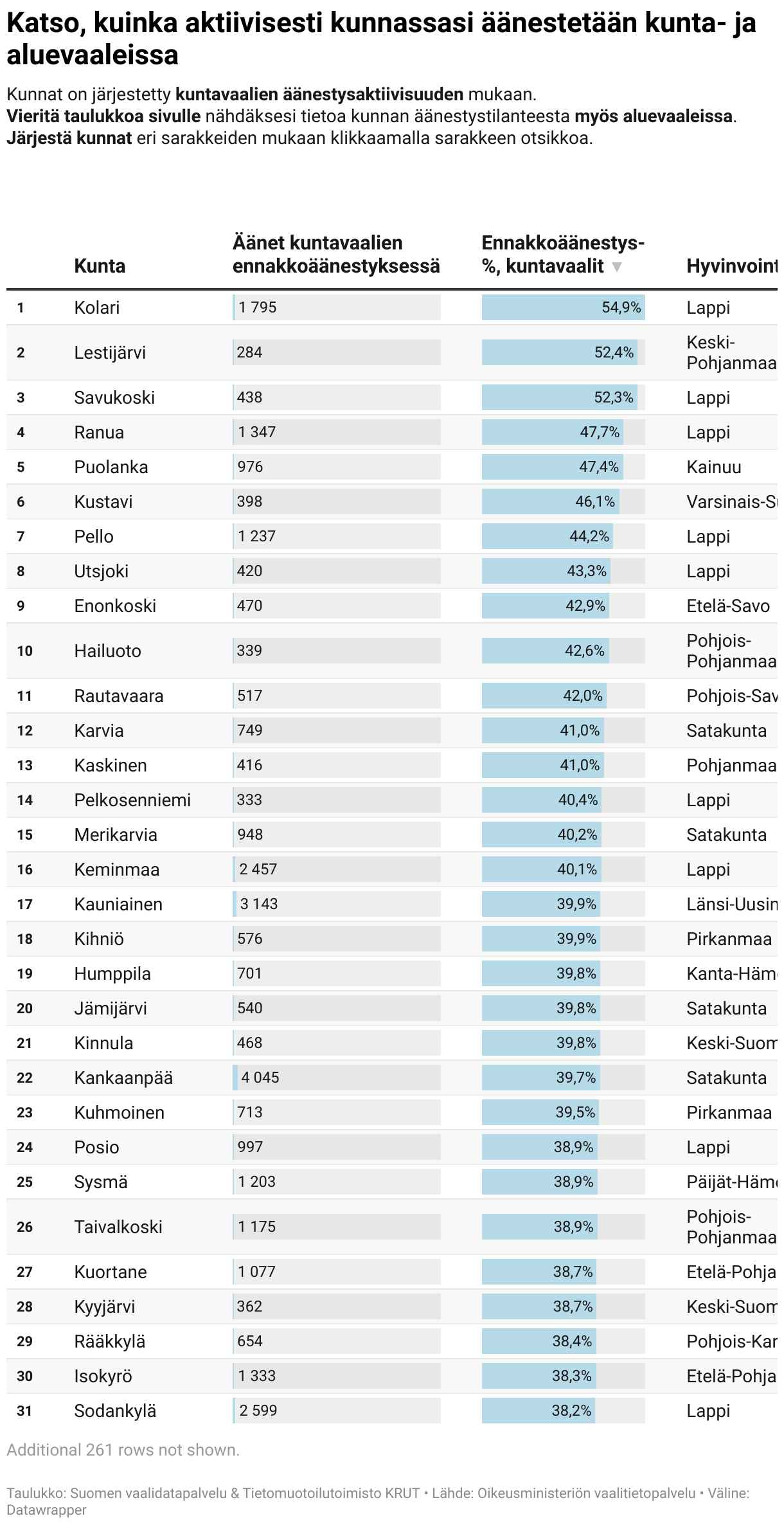 Oheisesta taulukosta voit etsiä kuntasi ja / tai hyvinvointialueesi äänestysaktiivisuuden.