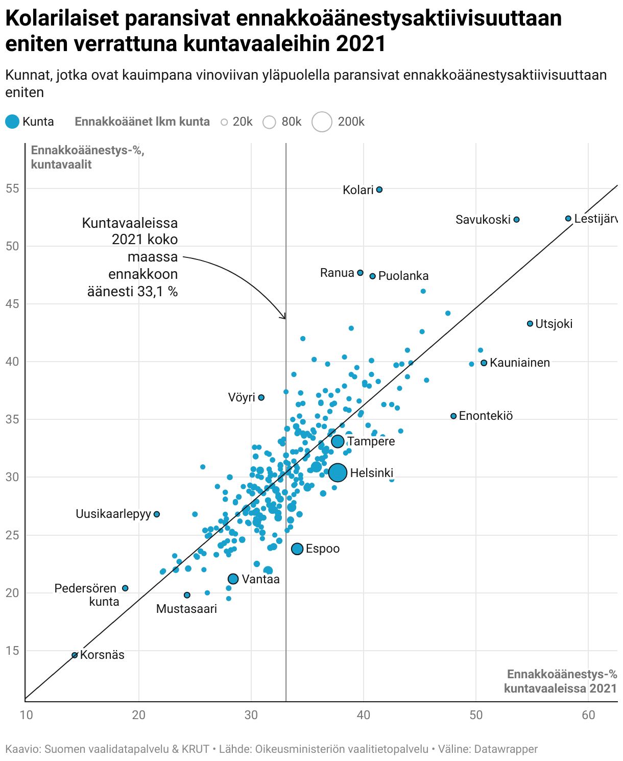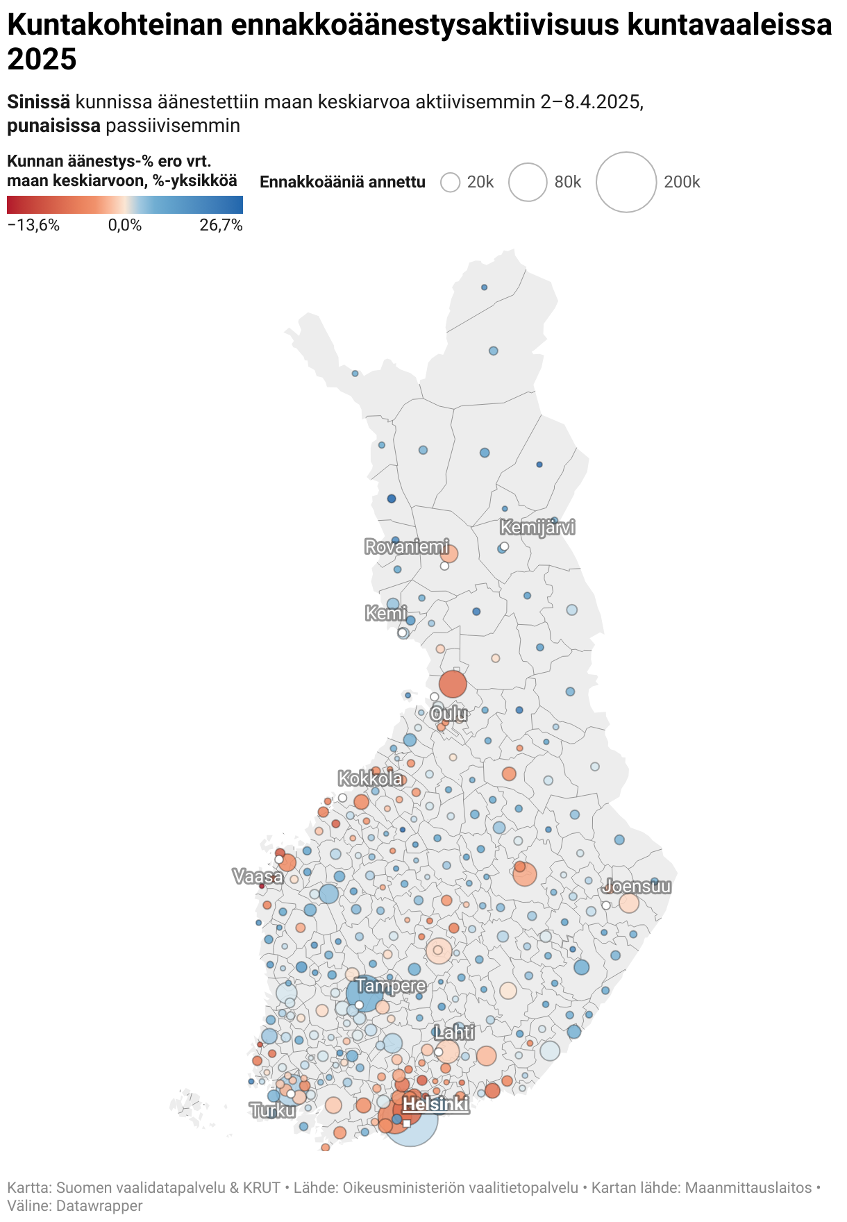 Seuraavissa vuorovaikutteisissa kuvaajissa ennakkoäänestysaktiivisuutta kuvataan eri tulokulmista. Oheisessa kartassa nähdään, missä kunnissa äänestettiin muuta maata aktiivisemmin ja missä passiivisemmin.