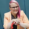Riikka Nieminen nojaa oranssiin kävelykep...